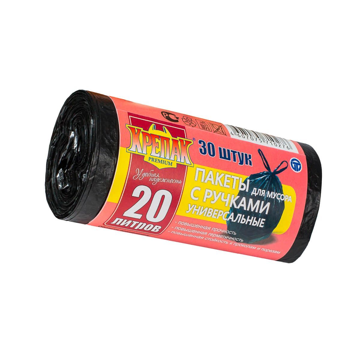 Мешки для мусора 20 л, с ручками, черные, в рулоне 30 шт., ПНД, 10 мкм, 550х440 мм, Крепак, 4607075710276